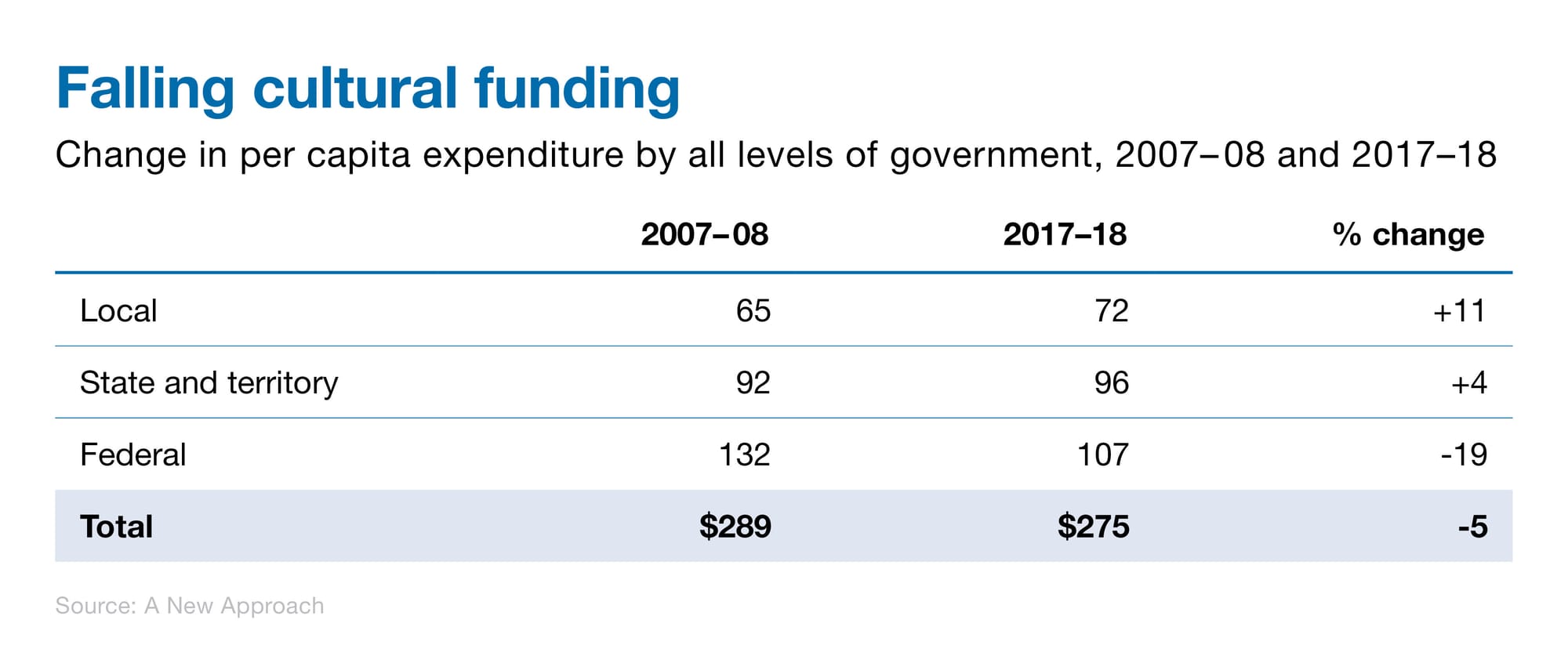 A New Approach’s first report is on a topic of perennial interest to the cultural sector – government funding. The report collates available public data on cultural funding across the three levels of government, giving us an overall picture in an easily digestible form for the first time.
