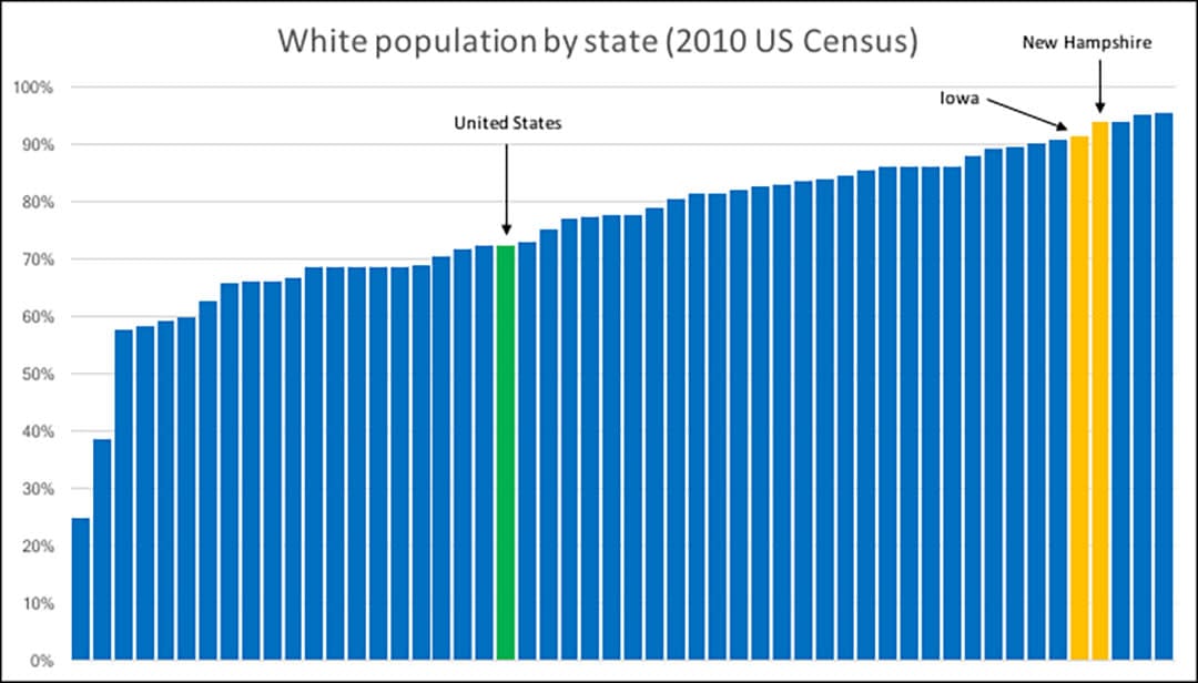 In the 2010 Census, New Hampshire and Iowa were 94 per cent and 91 per cent white, respectively. The perceived whitewashing of early-voting has drawn criticism on the contention that these states do not reflect America’s diversity, as seen in the graph below.