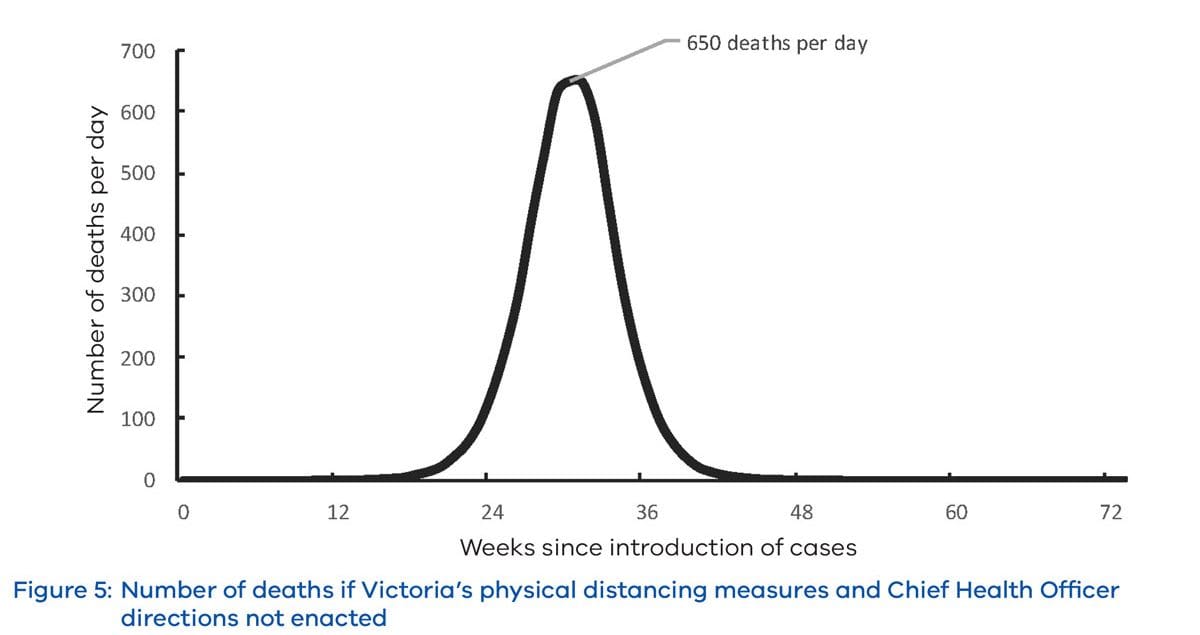 It shows that, without the measures put in place, Victoria’s potential death rate would have averaged 70 a day, and up to 650 deaths a day at its peak. Under this modelling, up to 36,000 Victorians would have died.