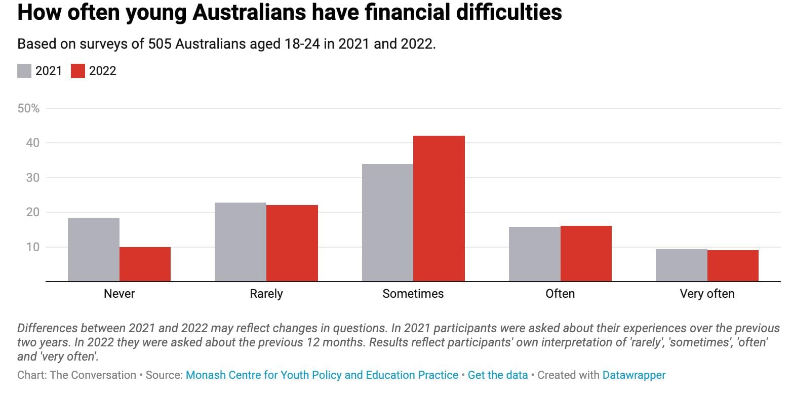 Our 2022 survey reports that 90% of young Australians experienced financial difficulties at some point during the past year. About a quarter said this happened often or very often.