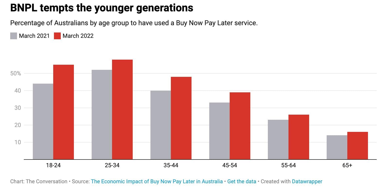 In the 2021 Australian Youth Barometer, 53% of participants said they had used a BNPL service. That result was broadly consistent with research from the Australian Finance Industry Association. In March 2021, AFIA’s surveys found 44% of those aged 18-24, and 52% of those aged 25-35, had used BNPL. By March 2022 those percentages rose to 55% and 58%, respectively.