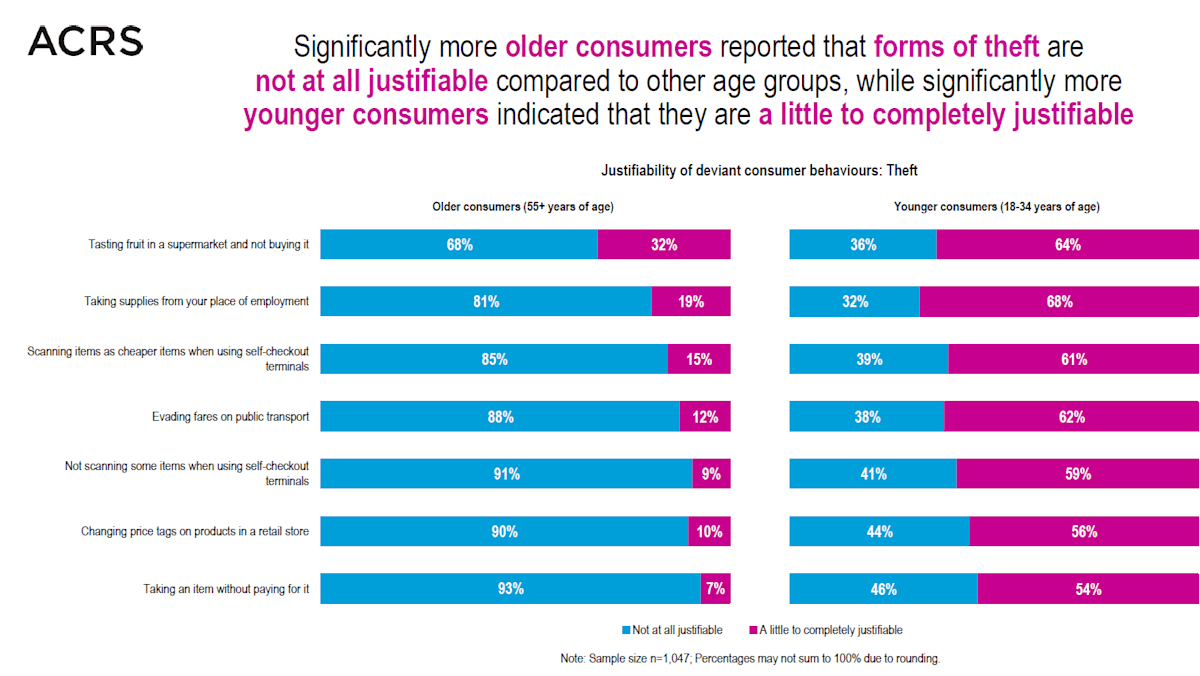 There were stark differences in how justifiable these deviant behaviours were viewed by different age groups. Significantly more older consumers (55-plus years of age) considered retail theft behaviours as not at all justifiable compared to other age groups, while significantly more younger consumers (18-34 years of age) indicated that forms of theft are a little, to completely, justifiable.