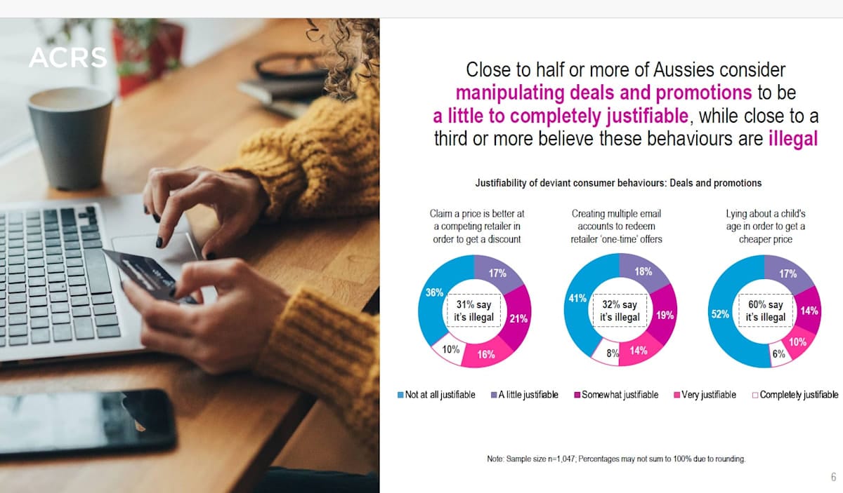 Close to half or more of Aussies consider manipulating deals and promotions to be a little, to completely, justifiable. For example, shoppers reported it’s a little to completely justifiable to lie about a child’s age to get a cheaper price (47%), create multiple email accounts to redeem a retailer “one-time” offer (59%), and claim a price is better at a competing retailer to get a discount (64%).