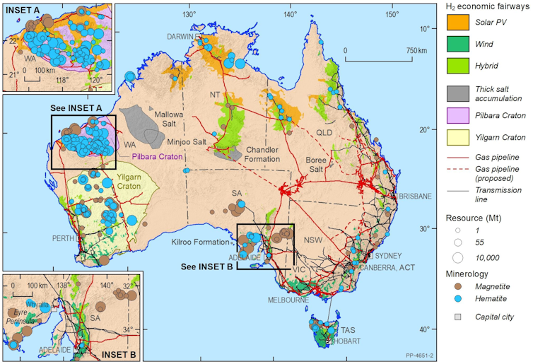 Our new research shows co-locating plants in sun-rich, iron-rich places such as Western Australia’s Pilbara and South Australia’s Eyre Peninsula can help overcome the “first mover problem” for green hydrogen – you can’t have a hydrogen industry without buyers for it, and you can’t have buyers without hydrogen.