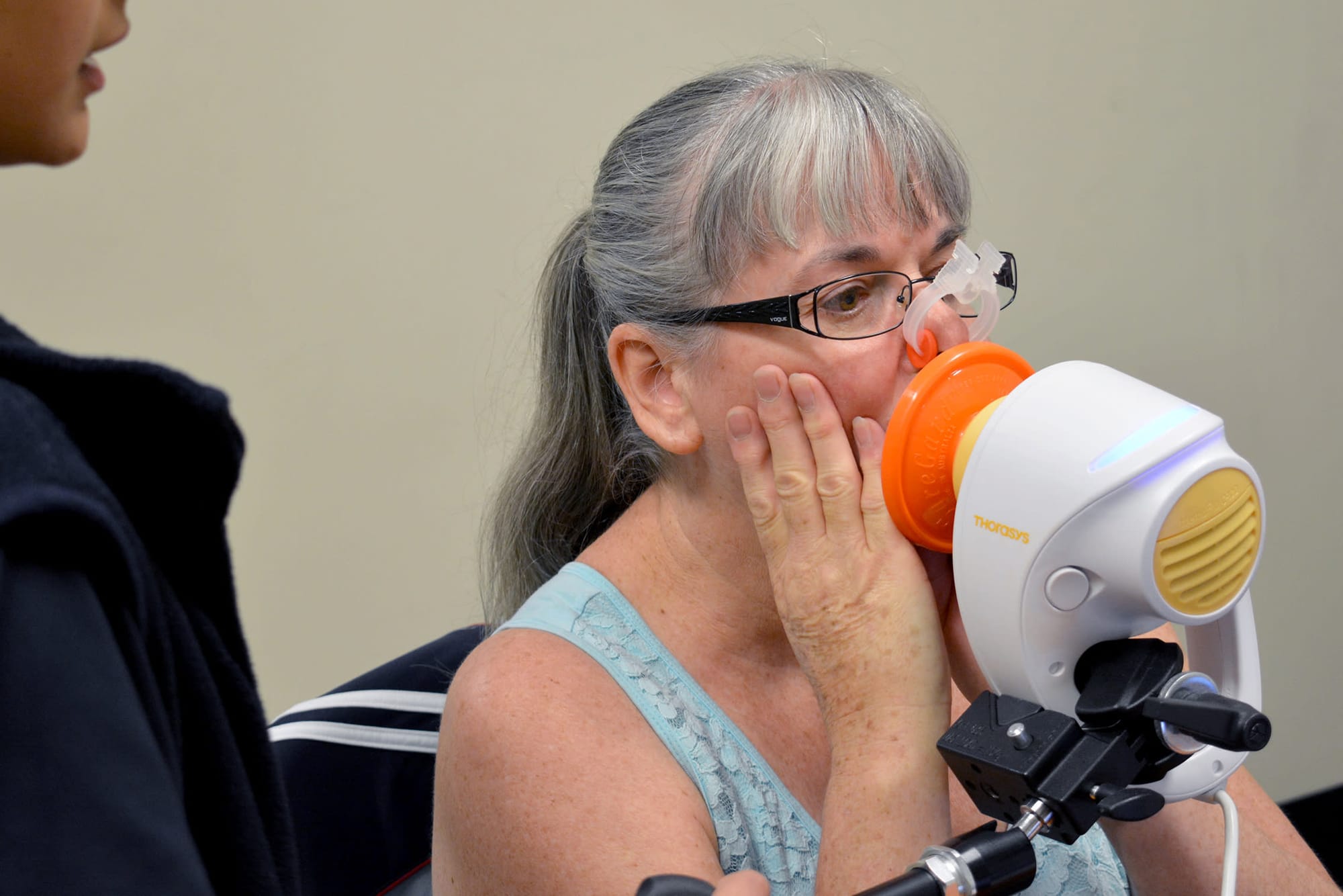 The tests for her and everyone else who put their hand up include two novel techniques in the FOT and also the multiple-breath nitrogen washout, which evaluates how evenly gases move in the lungs. The more routine tests of spirometry (measuring the volume of breath being forcibly exhaled) and measurement of gas transfer are also used.