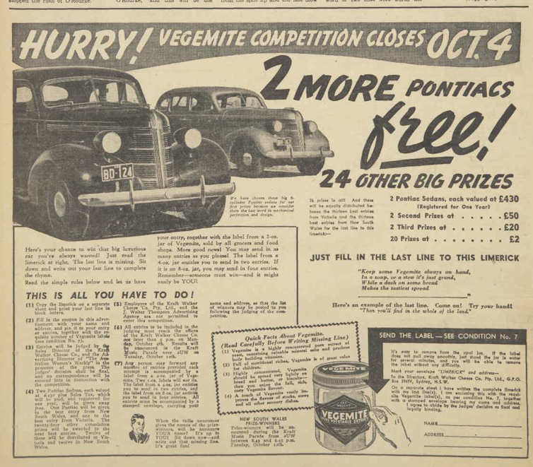 Kraft-Walker also ran limerick competitions to advertise Vegemite. Entrants would write the final line of a limerick to enter into the draw to win a new car.