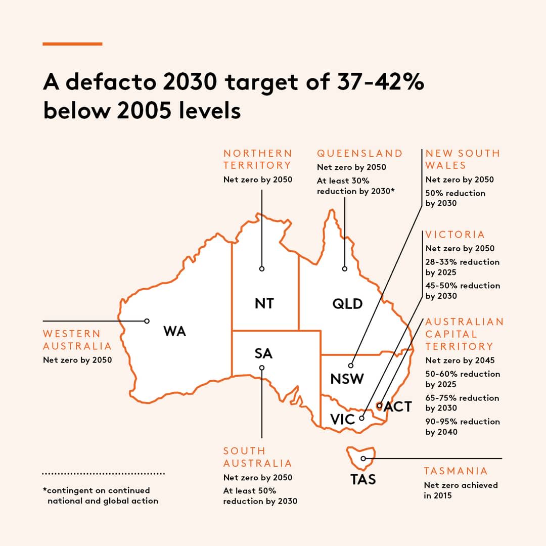 As of July 2020, Australia’s state and territory governments have set a target of net zero emissions. For most, this is by 2050, and these commitments cover all emissions produced in Australia. In doing so, they represent an important step towards serious coordinated action on climate in Australia.