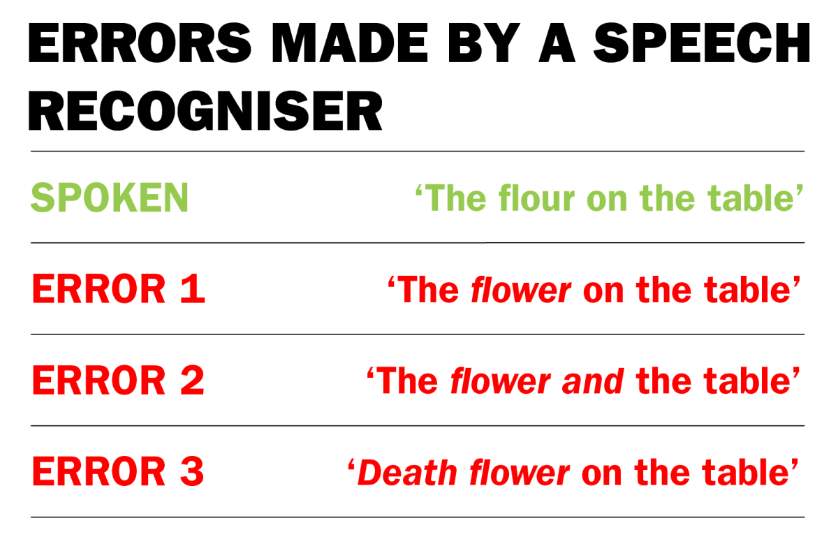 These problems are exacerbated by errors in automated speech recognition – the technology that allows people to speak to computers. Automated speech recognition errors may happen due to out-of-vocabulary words or rare words, which a speech recogniser may mishear as a common word, or words that are being used outside their usual context. The table below illustrates three errors made by a speech recogniser for the description “the flour on the table”.
