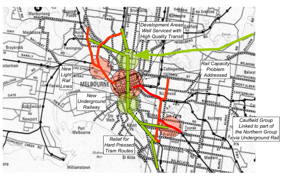 Originally called the North-South Underground Project, the concept was to link the two largest groups of railways in Melbourne – the Caulfield Group (all trains running through Caulfield Station) with the Northern Group (all trains running through North Melbourne Station), via a new underground tunnel.