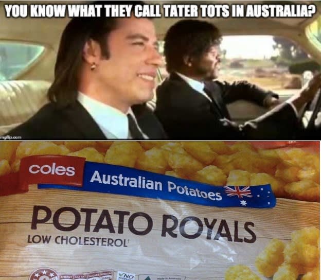 Look, I love potatoes as much as the next person. A few months ago, I went to the shop to buy what we Americans call “tater tots”. I got so excited by what I saw in the Coles freezer that I made a meme: