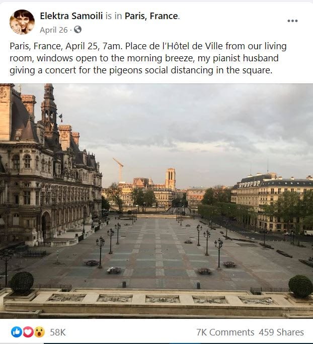 As to the type of engagement experienced on the page, this post below from Paris on 25 April is a case in point. In addition to sharing the photo of her living room overlooking the historic Place de l’Hôtel de Ville in Paris, a stunning scene in itself, Elektra wrote about her “pianist husband giving a concert for the pigeons social distancing in the square”.