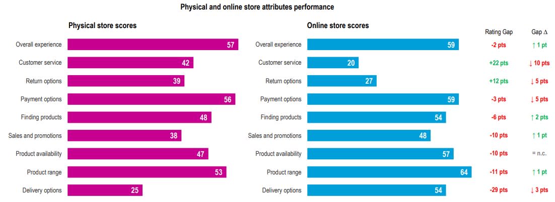 Historically, physical stores have scored higher than online stores on customer relationship factors such as like customer service (score of 42 v 20, respectively) and return options (score of 39 v 27), while online stores have scored higher than physical stores on pricing factors such as sales and promotions (score of 48 v 38, respectively) and payment options (score of 59 v 56).