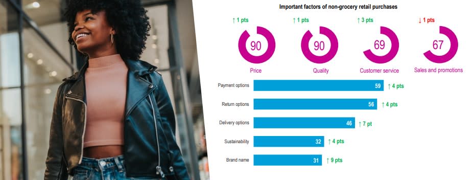 When asked to rate important factors influencing their purchase decisions, Aussie shoppers scored price and quality as the most important factors (both scoring 90 out of 100), followed by customer service (score of 69), sales and promotions (score of 67), payment options (score of 59), and return options (score of 56).