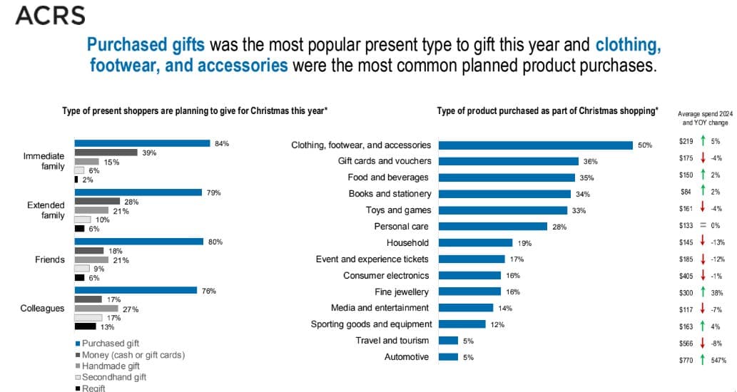 Half of Aussie shoppers (50%) expect to purchase clothing, footwear, and accessories as part of their Christmas shopping. Other popular products purchased for Christmas this year include gift cards and vouchers (36%), food and beverages (35%), books and stationery (34%), toys and games (33%), and personal care items (28%).