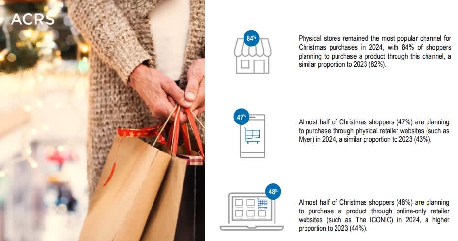 Online shopping remains a popular channel among shoppers this year, with 47% of Christmas shoppers planning to purchase through physical retailer websites (such as Myer), and 48% planning to make a Christmas purchase through online-only retailer websites (such as The ICONIC).