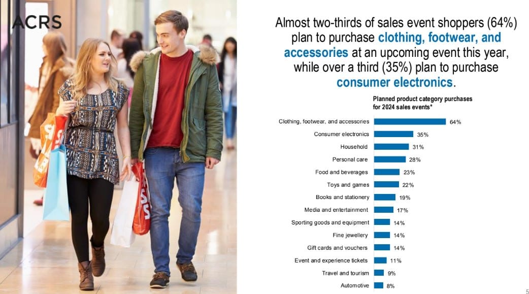 Fashion retailers are expected to benefit most, with 64% of sales-event shoppers planning to purchase clothing, footwear, and accessories at an upcoming sales event, followed by almost a third of shoppers who plan to buy consumer electronics (35%), household goods (31%), and personal care items (28%).