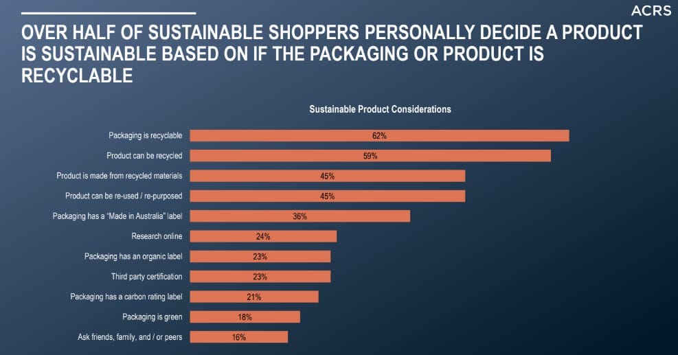 Labelling seems less important for sustainable consumers, with just under a quarter of shoppers (23%) using third-party certifications to determine if a product is sustainable, and slightly less basing their decision on whether the packaging has a carbon rating label (21%) or green packaging (18%).