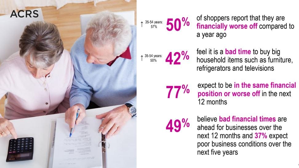 Among Aussie shoppers, 50% reported they’re financially worse off compared to a year ago, while two out of five consumers (42%) indicated it’s a bad time to buy big-ticket items such as furniture, refrigerators, and televisions.
