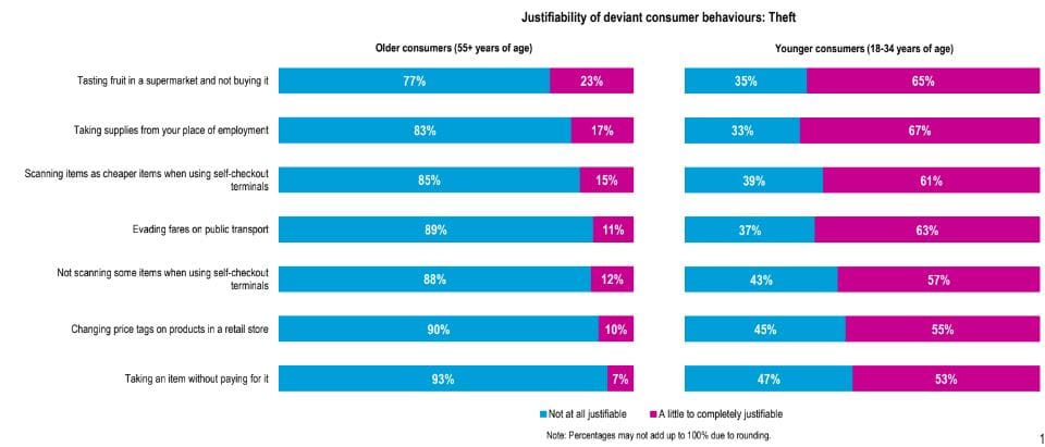 For example, “taking an item without paying” for it was “not at all” justifiable to 93% of older consumers but only 47% of younger consumers, while the remaining 53% of the latter group felt it was “a little” to “completely” justifiable. Similarly, “changing price tags on products” was “not at all” justifiable to 90% of older consumers versus 45% of younger consumers.