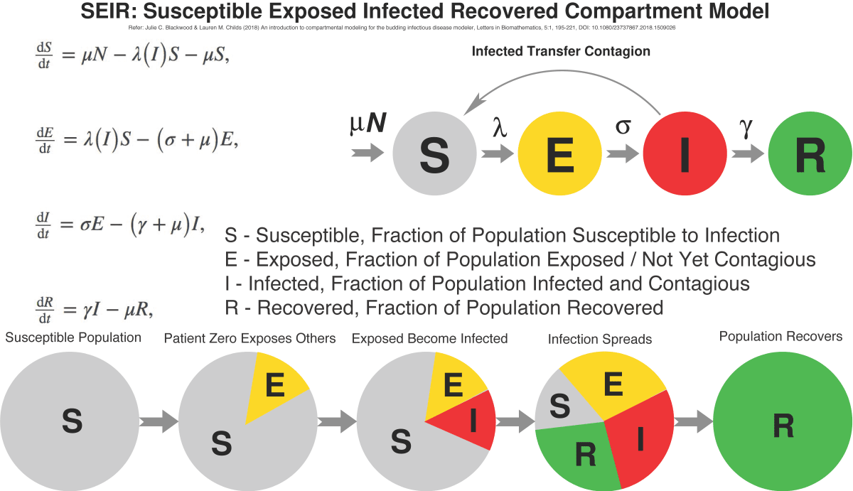In the SEIR model, it’s assumed that some fixed population is divided into four compartments, each representing a fraction of the population: