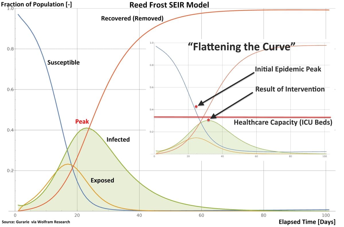 The notion of “flattening” the curve by social distancing is no more than reducing opportunities for a pathogen to spread. In effect, the value of R0 is reduced, and the area under the Infected curve in the model is spread over time.