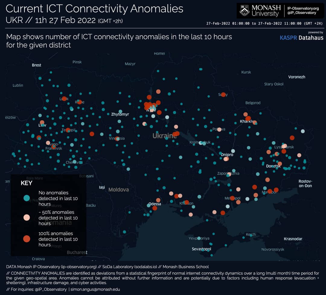 “So far, the Ukrainian internet is holding up. After the initial shelling, several districts within the major cities of Kyiv and Kharkiv experienced a sudden drop in their connectivity, but there’s been only a few major drops since,” says Associate Professor Angus.