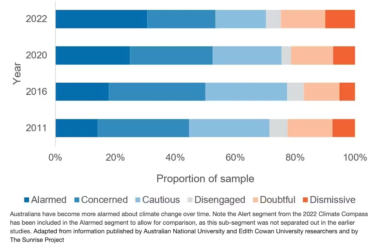 A range of segmentation studies conducted in 2011, 2016, 2020 and 2022 by researchers from both Australia and the US show Australians have become more worried over time. The “Alarmed” segment more than doubled between 2011 and 2022.