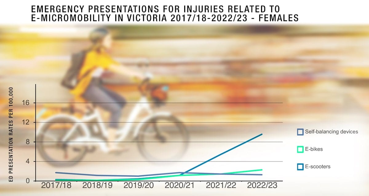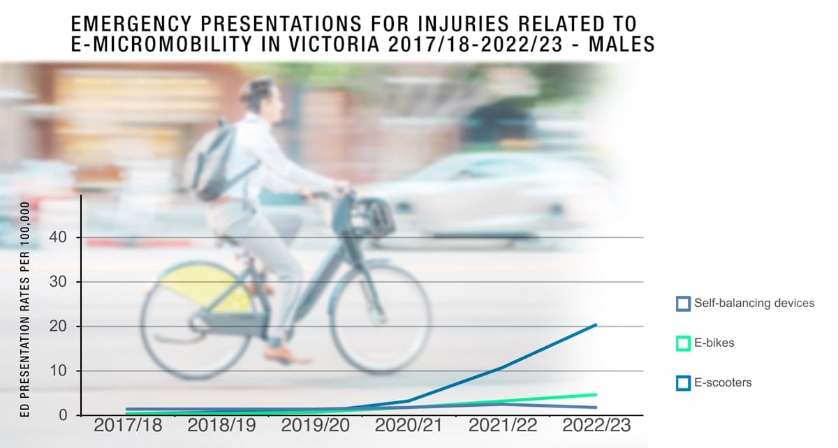 “Head, neck and face injuries were also relatively common, constituting 23% of e-scooter injuries, and 14-15% of e-bike and self-balancing device injury ED presentations in Victoria,” the report said.