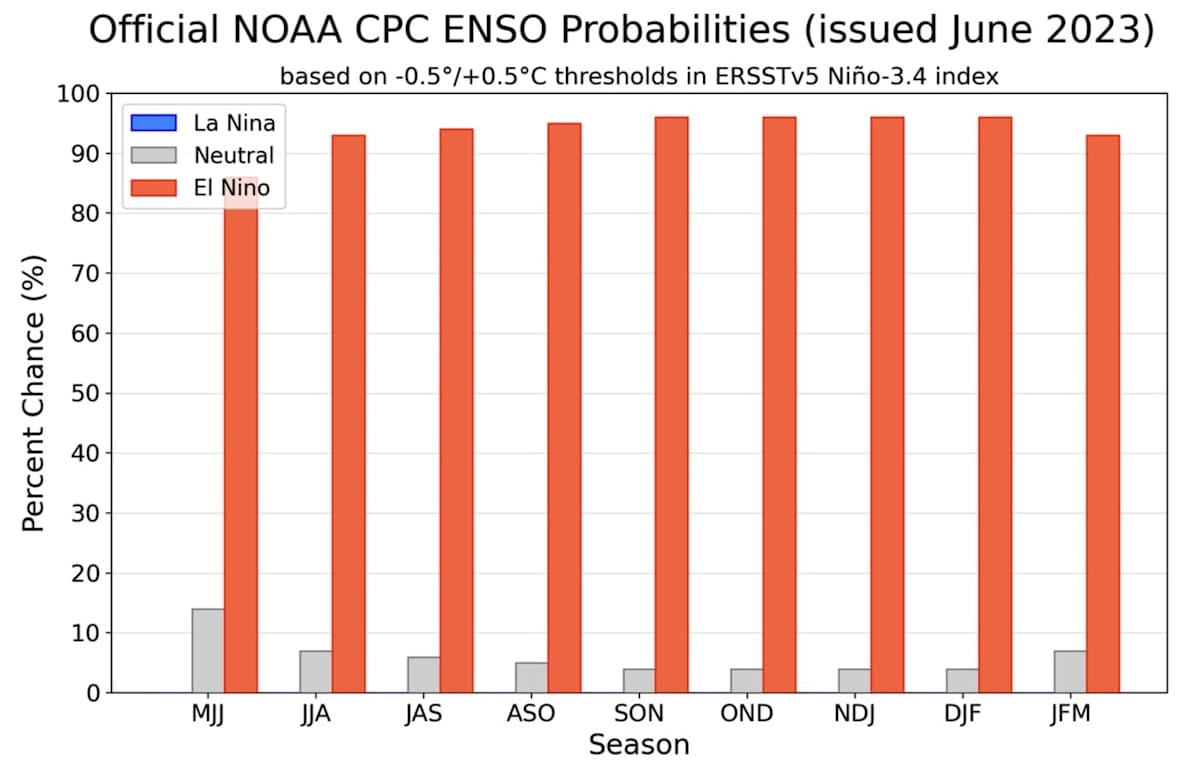 El Niño conditions are expected to gradually strengthen until the end of 2023 with a probability of over 90% – the probabilities run from May-July (MJJ) through to January-March (JFM).