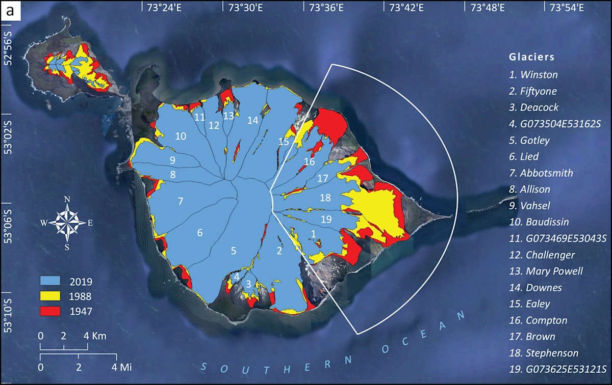 Using topographical maps from 1947 and satellite imagery from historical and current Earth observation platforms, the new research provides a comprehensive glacier inventory of the island, cataloguing 29 glaciers and tracing their outlines in 1947, 1988, and 2019.