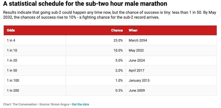 The more likely answer is that we'll have to wait until May 2032 to see someone – most likely not Kipchoge – go sub-2 in an official event. By that time, the chance of someone going sub-2 increases to 10 per cent.