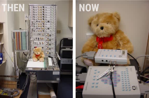 Sleep studies at Melbourne Children’s Sleep Centre have evolved from bulky 16-channel analogue paper recordings, which required staff to observe children in low light to avoid interference, to today’s compact digital systems with up to 60 channels, infrared video, and real-time monitoring. Image: Supplied