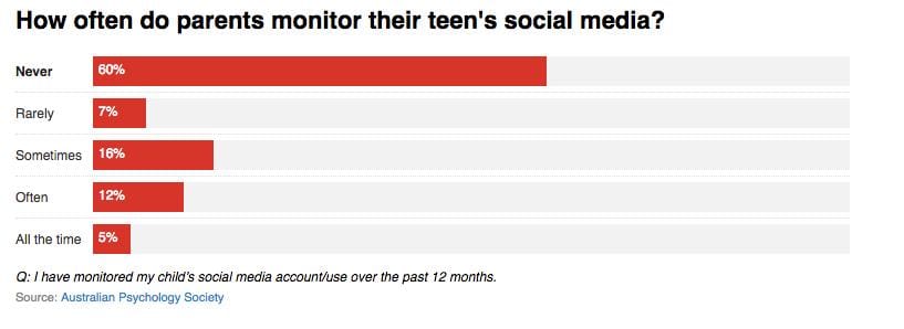 About 60 per cent of parents never monitor their teen’s social media account and are wrestling their own issues about how much is too much screen time. Most are unsure of how to provide good guidance of appropriate social media use with their teens.
