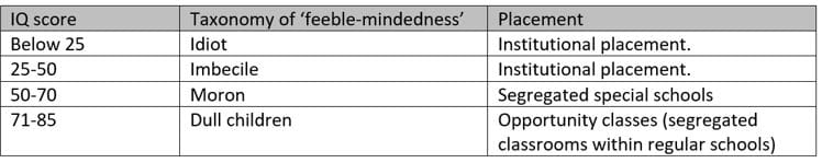 Mirroring the expanded taxonomy of ‘feeblemindedness’ developed by Goddard, and his selection of the number 70 on the IQ scale as the point at which feeble-mindedness began, the Victorian Department of Education developed a suite of increasingly segregated placements for people with disabilities that can be summarised as follows: