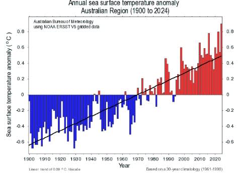Warm oceans nearer to Australia also have a double-whammy effect by helping warm the air and raising the humidity. Hence, when you have storms and weather systems that cause rain, both near the coast and inland, they pick up more moisture over a warm ocean than a colder one on the pathway to your location.