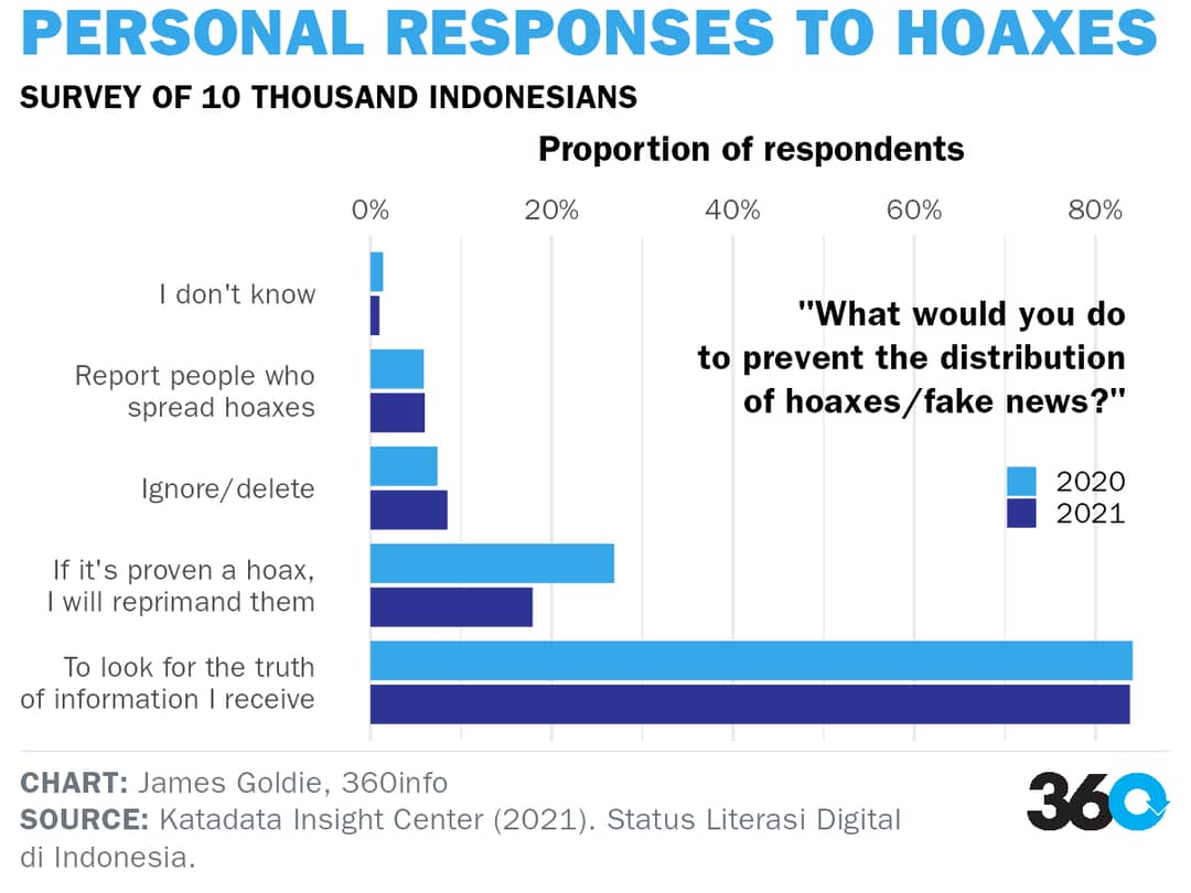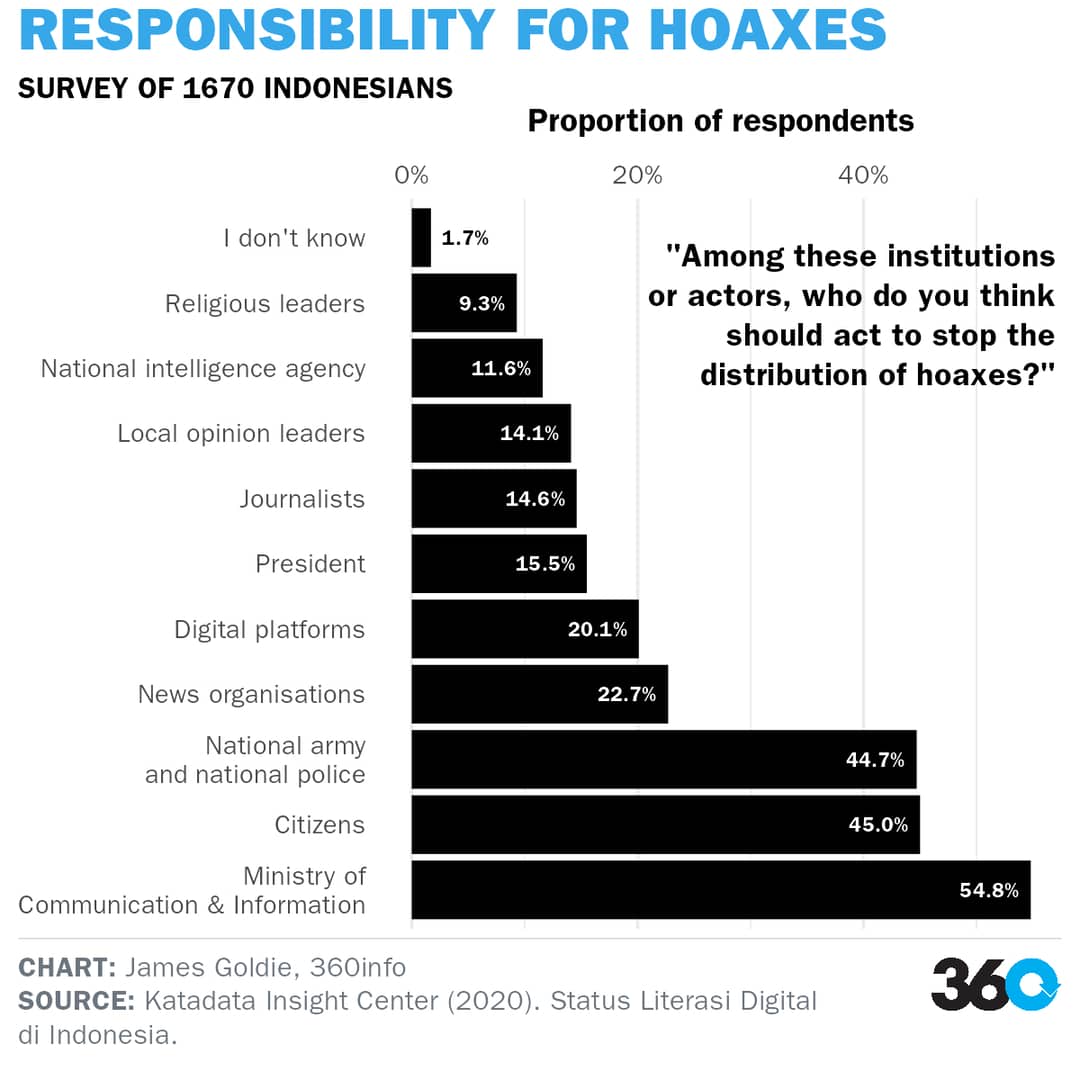 The literacy program has led Indonesians to believe the government, as opposed to individuals, will stop misinformation. A 2021 national survey conducted by the Ministry of Information and Communication and Kata Data Insight shows 63% of 10,000 people surveyed believed the ministry was the prime actor responsible for stopping the distribution of hoaxes – an increase from 54.8* of the 1670 respondents in 2020.