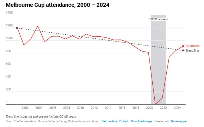 In 2003, in-person attendance at the Melbourne Cup was nearly 123,000, the biggest crowd since the turn of the millennium. By 2024, that had declined to 91,000.