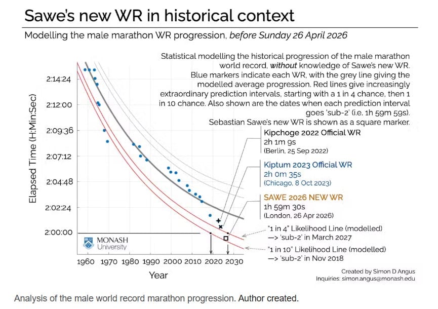If I use my framework to calculate the odds of Sawe’s actual time on that day, given the sweep of historical world records since 1960, I find the likelihood of 1:59.30 on 26 April 2026 to be one in 7.4 (about two in 15) – that’s pretty rare.