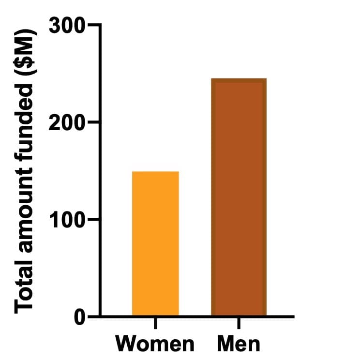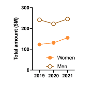 A positive trend, which requires significant acceleration in coming years, is that in 2019 men received 32% more funding than women, and this gap has gradually reduced to 23% in 2021.