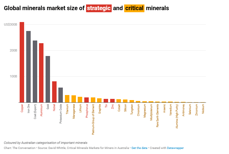 Critical mineral markets are often opaque and highly concentrated. The barrier to entry is high. Globally, the market for the 31 critical minerals on Australia’s list is valued at around A$344 billion – about the size of the global aluminium market.