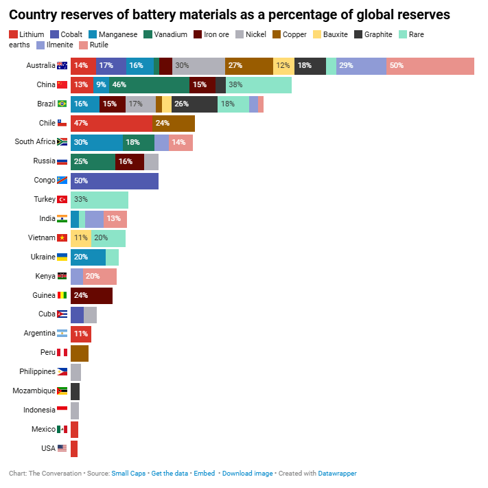 Many of these minerals lie under Australian soil. Australia is able to produce 9 out of 10 mineral elements required to produce lithium-ion batteries, such as lithium, nickel and cobalt. It also has the highest total reserves of battery minerals.