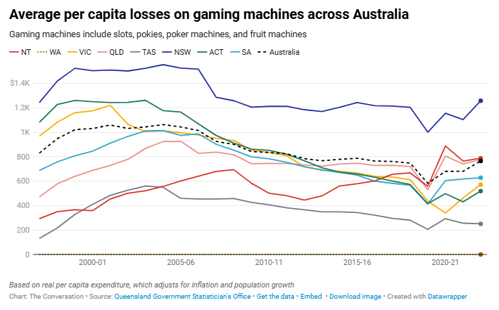 Australians lost A$15.8 billion on pokies in 2022–23, over half of that ($8.1 billion) in New South Wales. That’s an increase of 7.6% from 2018–19 (before pandemic restrictions closed many venues or restricted operations).