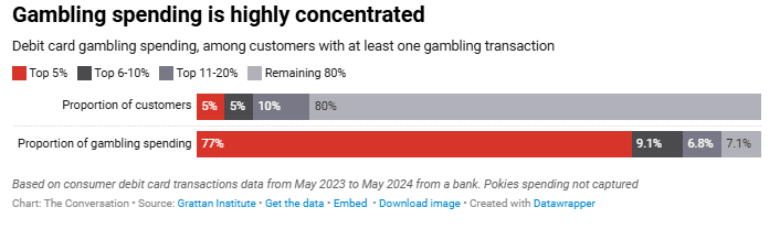 And in 2010 the Productivity Commission estimated 41% of the money lost on pokies came from the most seriously addicted, with another 20% coming from those with more moderate issues. Overall, well over half of the losses.