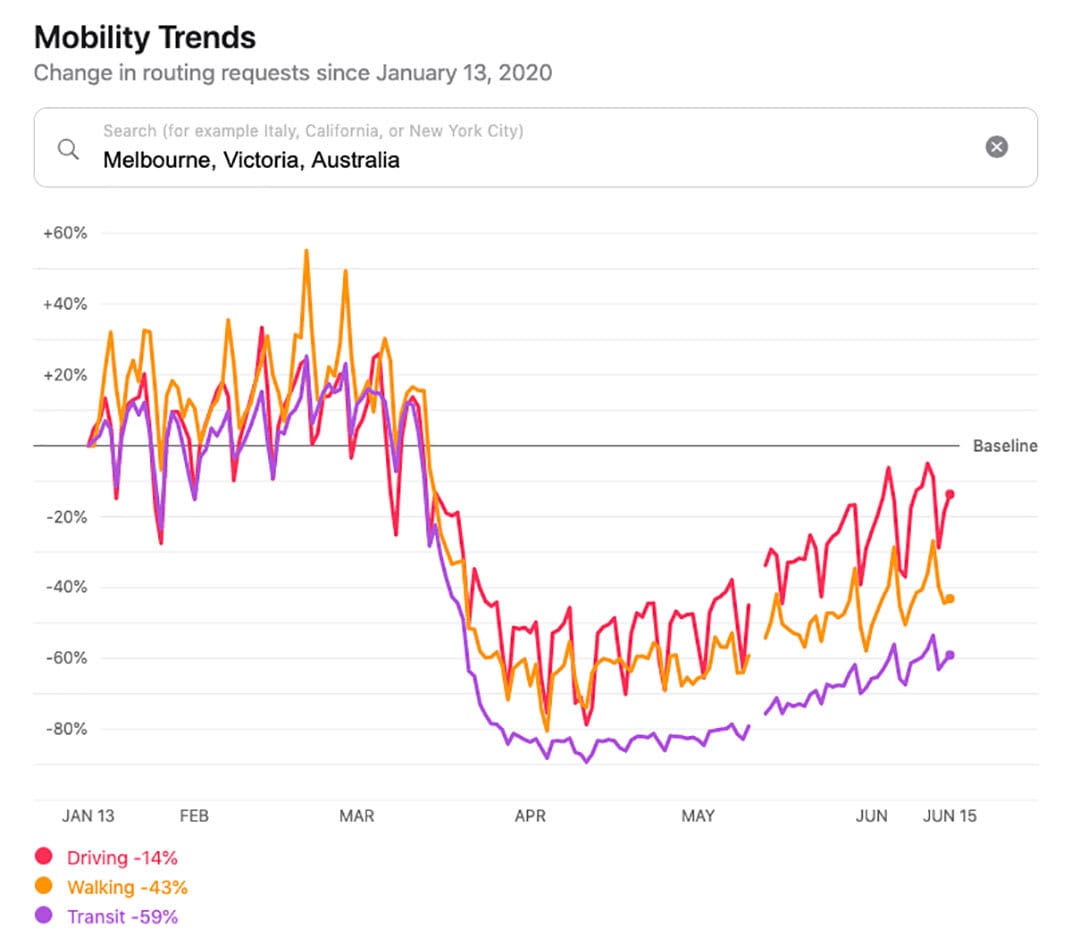 Apple Maps data (granted, an imperfect measure of traffic levels) shows that after a huge drop, driving levels are nearly back to where they were before COVID-19 restrictions – and this is at a time when employees are still required or urged to work from home if they can.