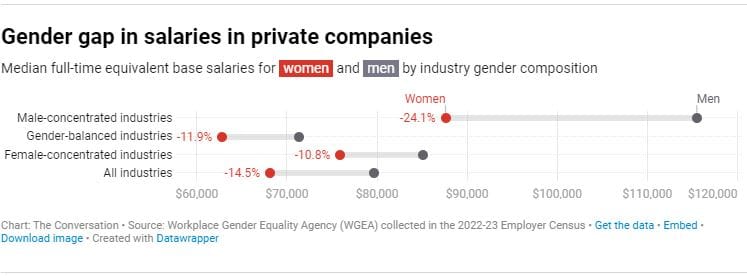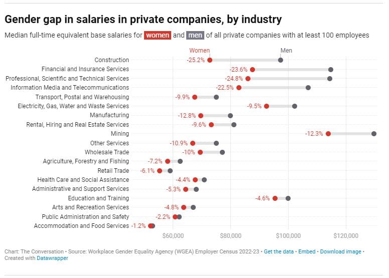 In this year’s snapshot released on Tuesday, the difference is largest in male-dominated industries (including mining, construction and utilities), with a gender gap in base salaries of 17.5%.