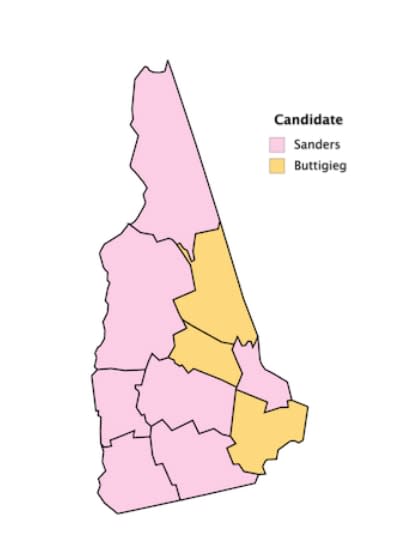 It may be argued that the multitude of candidates splitting the primary vote has favoured Sanders and Buttigieg, who won first and second place in all 10 of New Hampshire’s counties – Sanders winning seven to Buttigieg’s three (right).