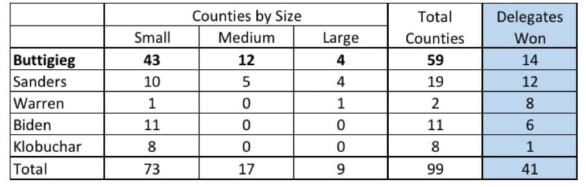 A telling factor in Buttigieg’s victory was his performance in smaller counties. Of Iowa’s 99 counties, Buttigieg won 59 to Sanders’ 19 (Warren, Biden and Klobuchar split the rest). Buttigieg, however, won 43 of Iowa’s 73 smaller counties, whilst Sanders was less successful in these smaller counties, winning 10.