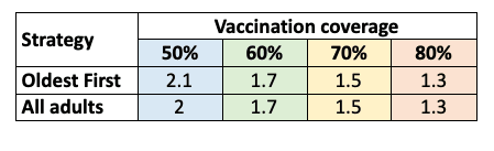 The advice suggests the latter. No matter how much of the population is eligible for an AstraZeneca vaccine, moving to the “all adults” allocation strategy slightly reduces transmission potential at lower levels of coverage, and this can translate to big savings in total cases and health services burden.