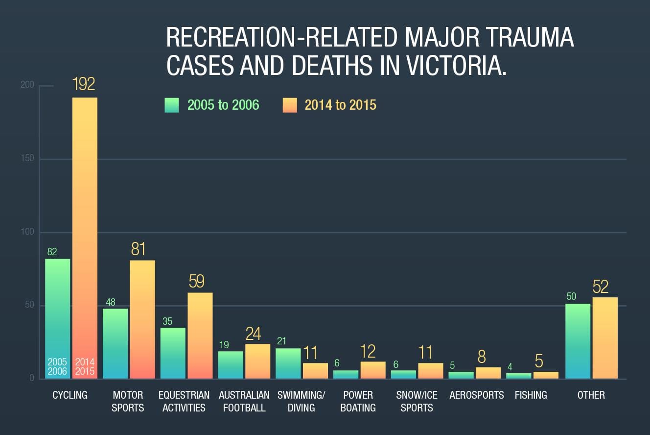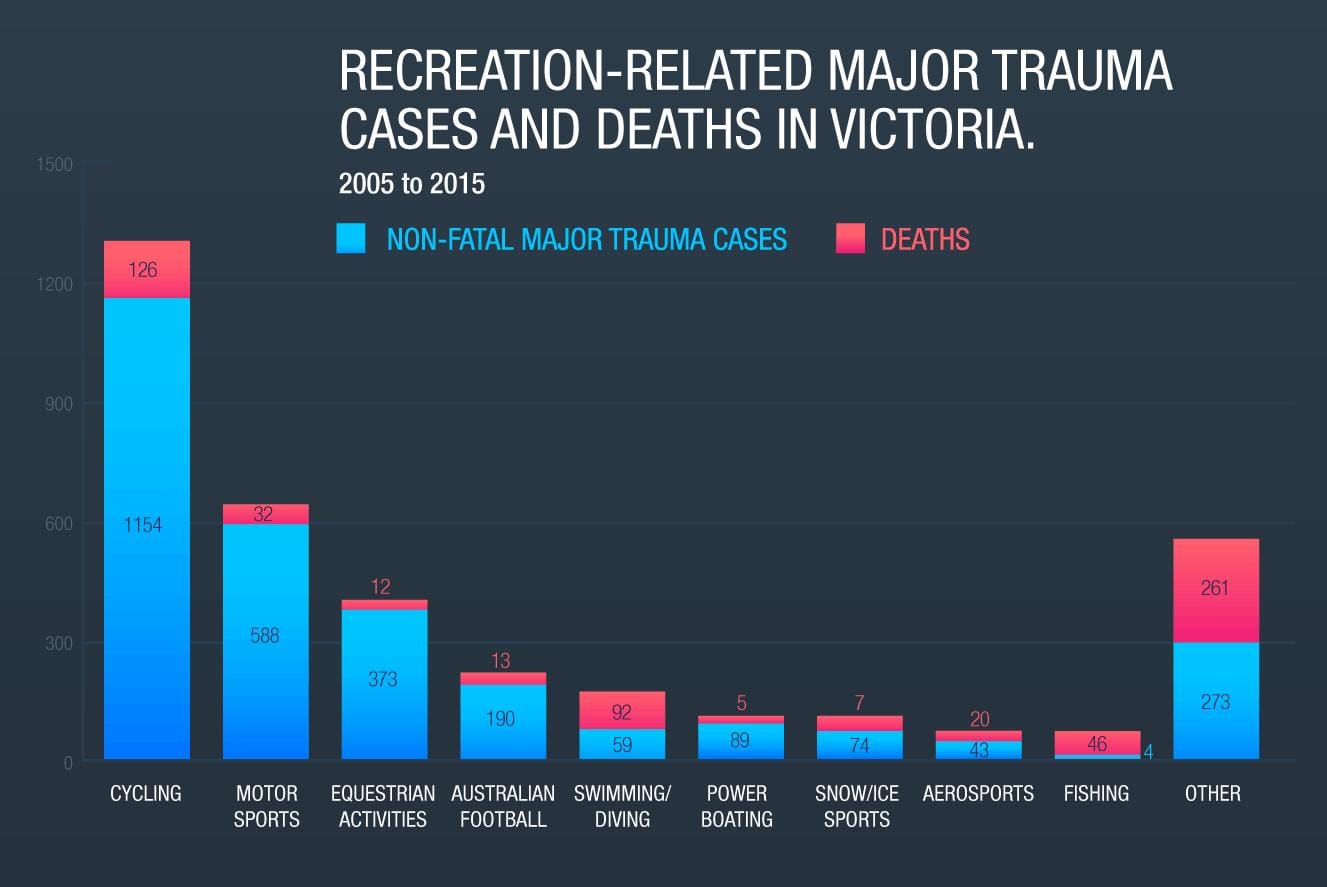 Dr Ekegren, of Monash’s Department of Epidemiology and Preventative Medicine, researched trauma and death in sport and recreation in Victoria with her team from Victorian State Trauma Registry, using data from 2005-2015. They cross-referenced it with changes in participation using Australian Bureau of Statistics numbers.