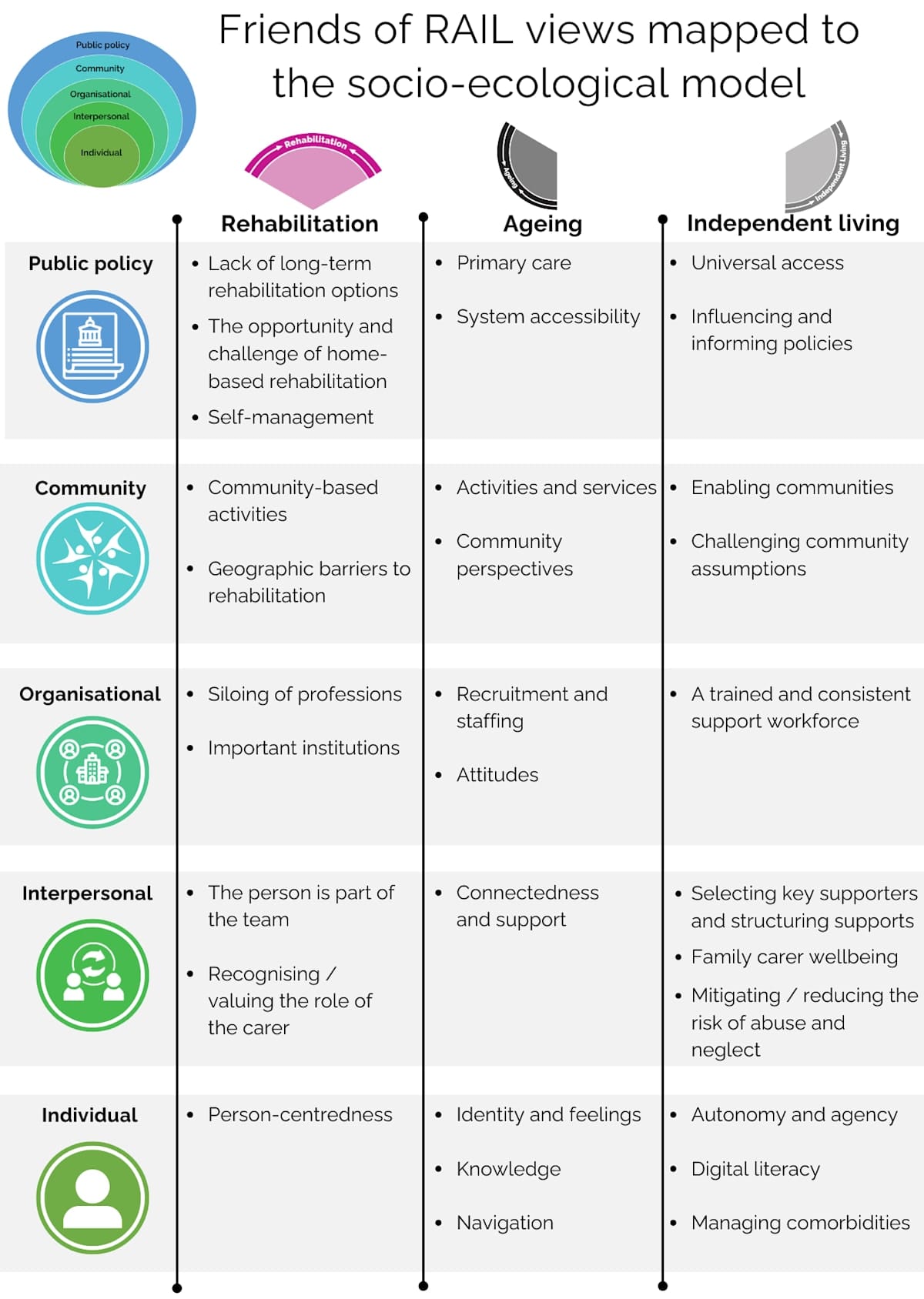 - Phase three: The RAIL research stream leads, senior research and postdoctoral research fellows, and the consumer and community engagement lead then undertook a content analysis of verbatim notes from the workshop and mapped this content to the Socio-Ecological Model.